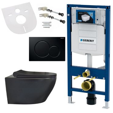Spülrandloses Hänge-WC mit Softclose Sitz, Schallschutz und schwarzer Betätigungsplatte passend für Geberit Vorwandelement